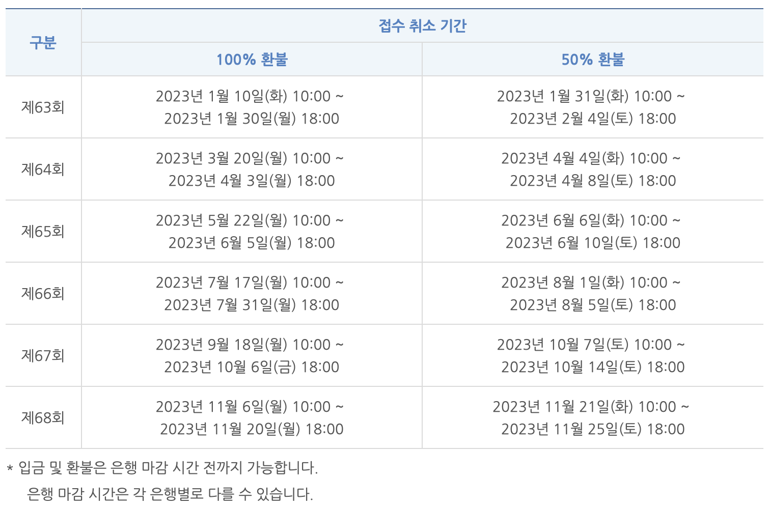 또한, 부득이한 사항으로 인해 한국사 자격증 시험의 접수 취소가 필요한 경우 접수한 날과 시험일을 기준으로 100% 환불, 50% 환불일정이 설정되니, 잊지 마시고 기억하셨다가 나중에 아까운 접수비를 손해 보는 일이 없으셨으면 합니다.