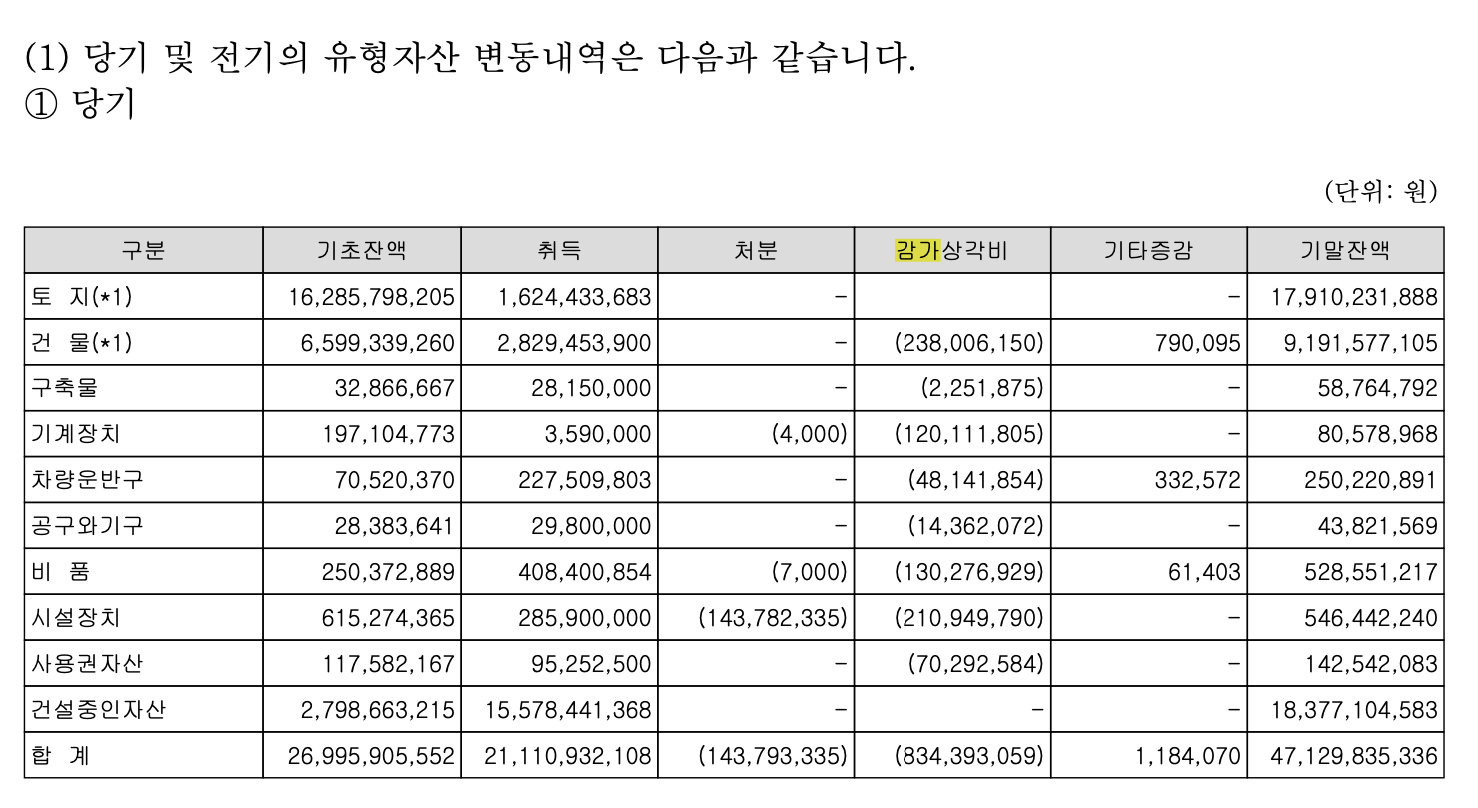 그리고, 예전에는 현금흐름표에 명시를 해주었으나, 보이지 않아 재무제표 주석으로 이동하여 감가 상각비를 찾으시면 됩니다.